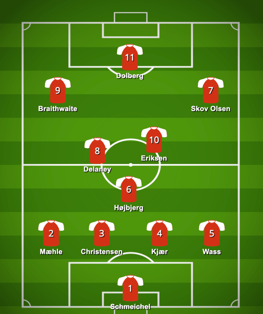 Denne startopstilling er meget tæt på, hvad Kasper Hjulmand har foretrukket indtil nu. Vi mener, at de eneste to positioner der er tvivl om på nuværende tidspunkt, er på angriberposten og på højrekanten. Jonas Wind har gjort det rigtig flot, men grundet Kasper Dolbergs internationale erfaring forventer vi, at han bliver tildelt den position.